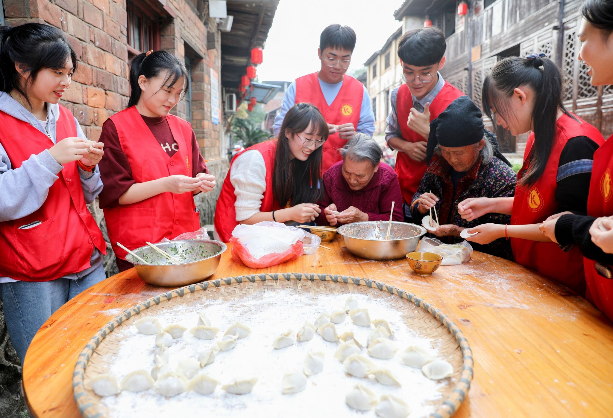 11月5日,永州市零陵区柳子街,大学生志愿者和老人一起包饺子。当天,新利·体育人文与社会科学学院的青年志愿者走进柳子街开展志愿服务活动,丰富老人的生活。33年来,该院志愿者每周都来到老街,关爱独居老人。 李谌涵 刘晨 摄影报道