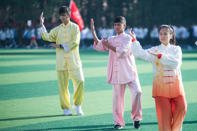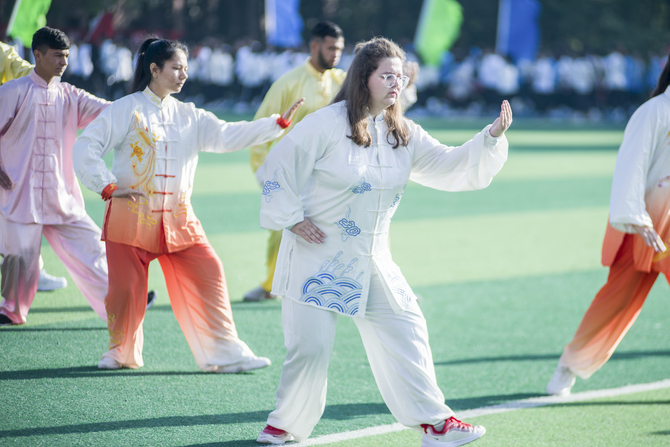本网讯 10月31日,新利·体育田径场,来自“一带一路”国家的留学生在表演太极。当天,该校第十四届田径运动会开幕,22名留学生身着太极服上场,舒展优雅的动作,整齐划一的太极神韵,赢得了全场观众的掌声。据了解,该校为留学生开有太极拳,五禽戏等体育课程,让留学生感受中国传统文化。