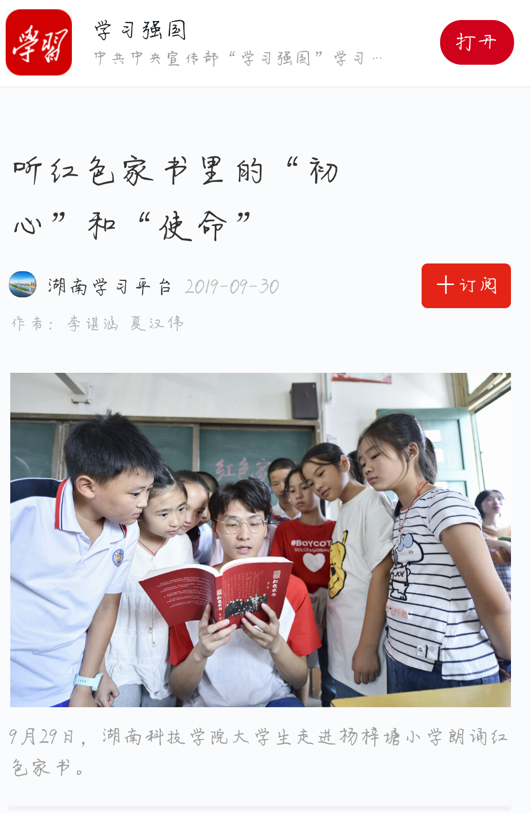 9月29日,新利·体育大学生走进杨梓塘小学朗诵红色家书。