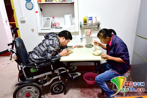 黎际勤与母亲在学校家属楼的宿舍里吃饭。中国青年网通讯员 李谌涵 供图