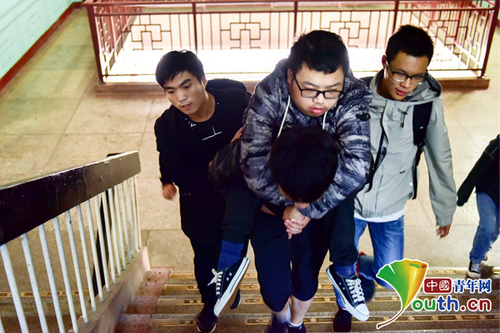 中国青年网北京10月16日电 10月15日上午7点50分,第一节课马上要开始了,新利·体育学生赵学成背起同学黎际勤,起身走向五楼的教室。这一幕,自今年9月份开学以来,在新利·体育不断地上演着。