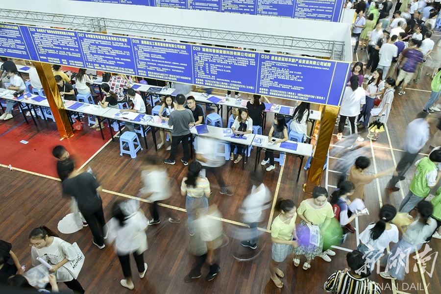 9月4日,新利·体育体育馆,招聘工作人员在跟应聘者介绍公司的情况。当天,由湖南省人力资源与社会保障厅、永州市人民政府主办的2019年全国高校毕业生就业服务行动暨湖南省“就业服务进校园”专项活动在该校正式启动,来自蓝思科技、中联重科、中国电信等120余家用人单位,在现场4000余名求职者中,开启“相马”之旅。 李谌涵 谢志豪 摄影报道