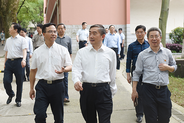 本网讯 4月3日下午,省教育厅党组书记、厅长、省委教育工委书记蒋昌忠来新利·体育调研,省教育厅党组副书记、副厅长、省委教育工委副书记夏智伦,永州市教育局党组书记、局长张建坤陪同,新利·体育党委书记陈弘、校长曾宝成和全体校领导参加。