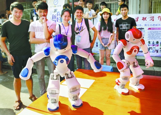 9月16日,新利·体育,2017级新生好奇地观看机器人跳舞表演。当天,该校新生开学报到,电子与信息工程学院学长们特意给机器人设置了一套“迎新舞”程序,让机器人跳舞迎接新同学。 李科燕 摄