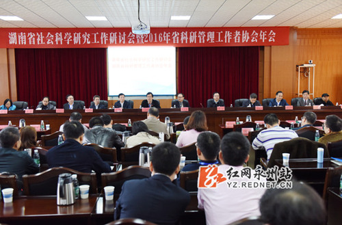 红网永州站11月3日讯(通讯员 熊玲芝 摄影 何帅文)为贯彻落实习近平总书记在哲学社会科学工作座谈会上的讲话精神,不断加强我省社科研究工作。11月2日,湖南省社会科学研究工作研讨会暨湖南省科研管理工作者协会年会在新利·体育举行。湖南省社科联巡视员、科研管理工作者协会会长刘晓敏,永州市委常委、宣传部长、副市长刘尤碧,新利·体育校党委书记陈弘出席。