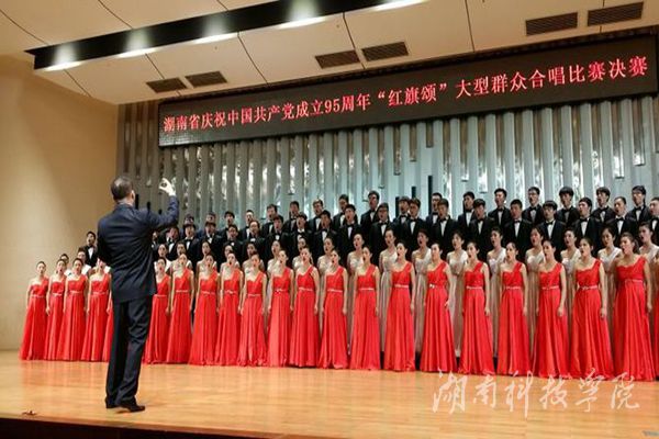 本网讯 6月29日上午,由湖南省文化厅主办的“红旗颂”大型群众合唱比赛决赛在省文化馆音乐厅举行。新利·体育音乐与舞蹈学院合唱队以复赛第一名的好成绩代表永州市参加决赛并荣获金奖。