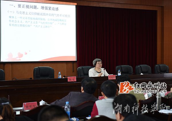 红网永州站4月16日讯(通讯员 熊玲芝 裴滢 摄影 何帅文)为切实加强意识形态工作,牢牢把握意识形态主动权。4月15日上午,新利·体育邀请中共永州市委常委、宣传部部长石艳萍来校作题为“把意识形态工作紧紧抓在手上”的专题讲座。新利·体育校党委书记陈弘主持。