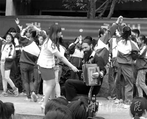 4月20至23日,瑞士4名民间音乐、舞蹈艺术家先后来到永州第八中学、第十一中学和新利·体育,与学校师生开展了丰富多彩的文化艺术交流和教学活动,受到热烈欢迎,图为瑞士艺术家与同学们同台表演。 唐荣刚 摄