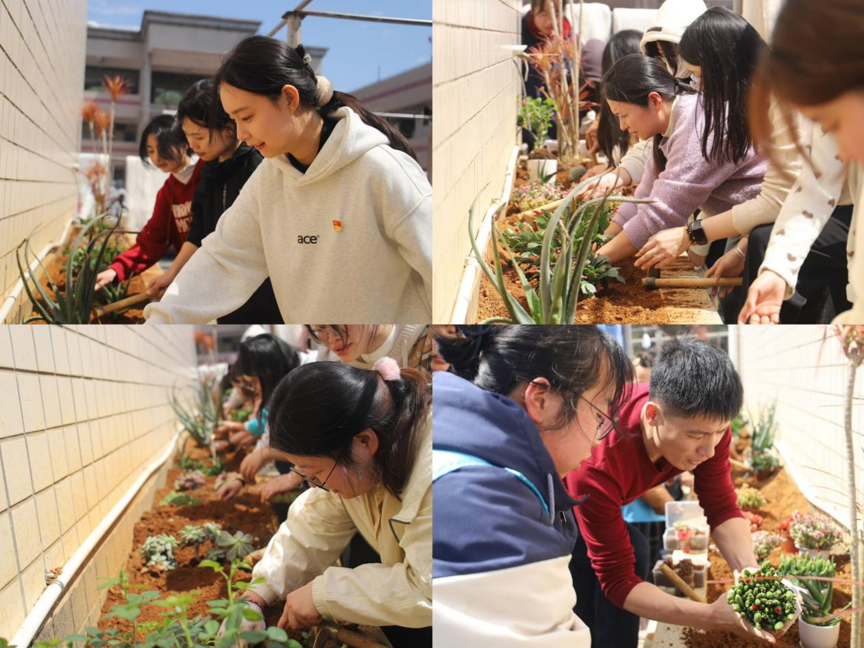 在桃园“一站式”学生社区,经管学院师生党员化成巧手花匠,放苗、覆土、浇水,现场充满着欢快的氛围。栽种好的树苗在阳光下迎风挺立,焕发生机,为校园平添了更多生机。