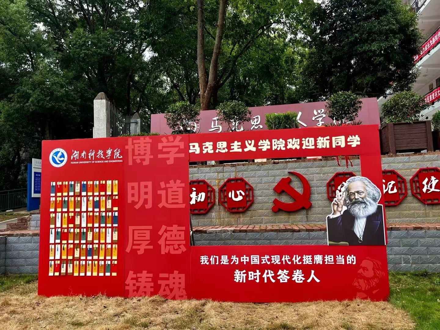 马克思主义学院的学长学姐们亲手为新生制作了专属书签,书签正面是新生的姓名,背面则是学长学姐们精心挑选的寄语,新生摘下属于自己的书签,再写下自己对未来四年的期许,重新挂回背景板。“这代表了一种传承,希望我们可以将学院精神代代相传,也希望同学们在马院大家庭中携手共进。”志愿者介绍。