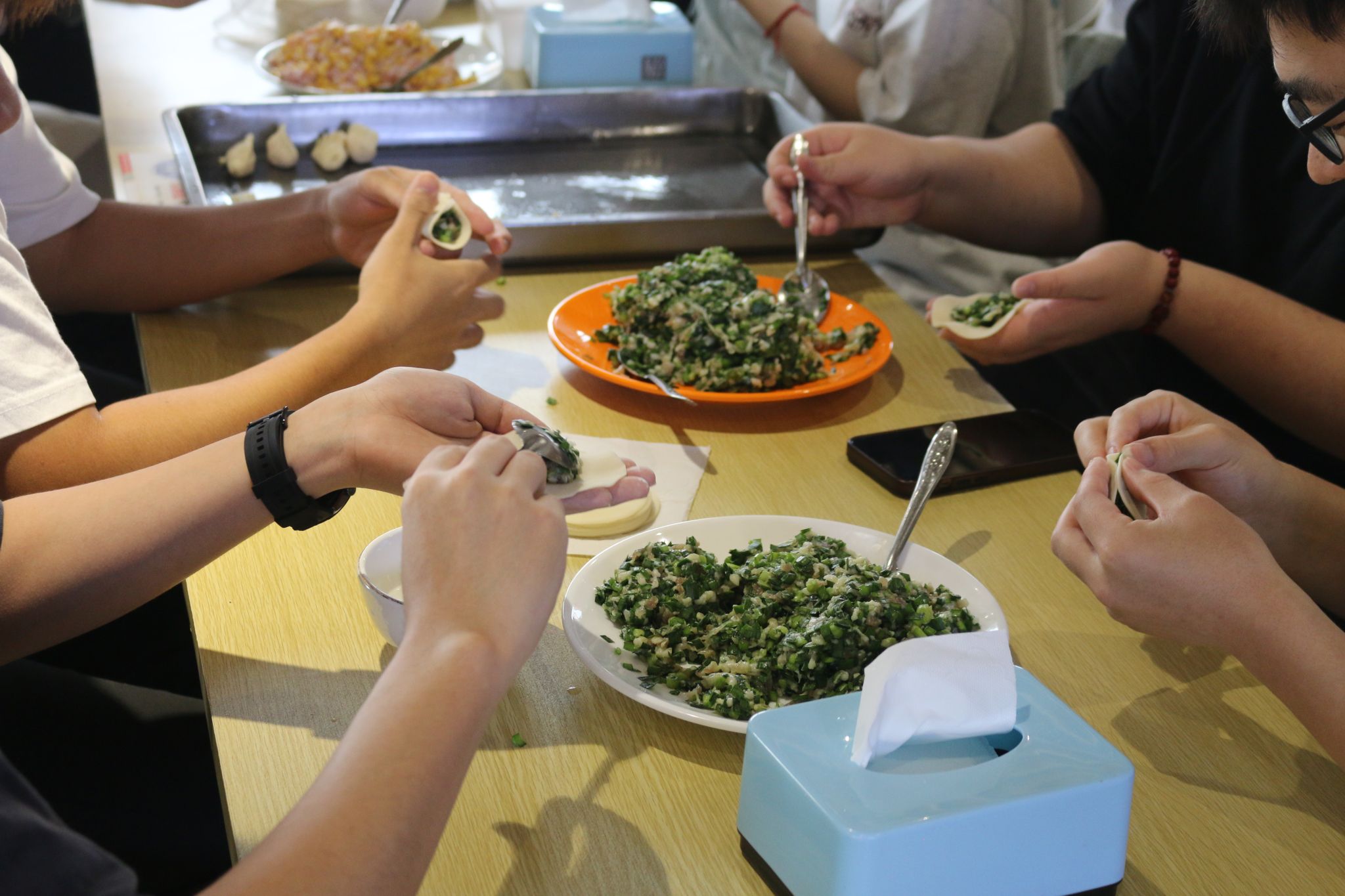 活动当天,百余名师生齐聚食堂,在食堂师傅的指导下,擀皮、调馅、包饺,分工协作间尽显劳动之美。老师与同学们围坐一桌,一边包饺子一边畅聊假期生活,鼓励大家在劳动中培养团队精神、提升实践能力。