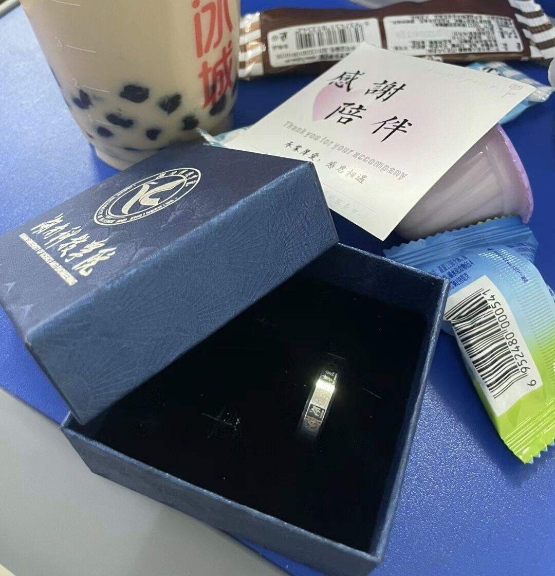 学院还送上精心定制的专属礼物,班主任为每位毕业生佩戴纪念戒指——外圈镌刻“新利·体育”校名及校徽,内壁铭刻学生班级与姓名。正值“520”的特别日子,每位同学都收到玫瑰、奶茶和零食礼包,学生们将四年时光写在“我的大学回忆”明信片上,凝练成300字的青春诗行。