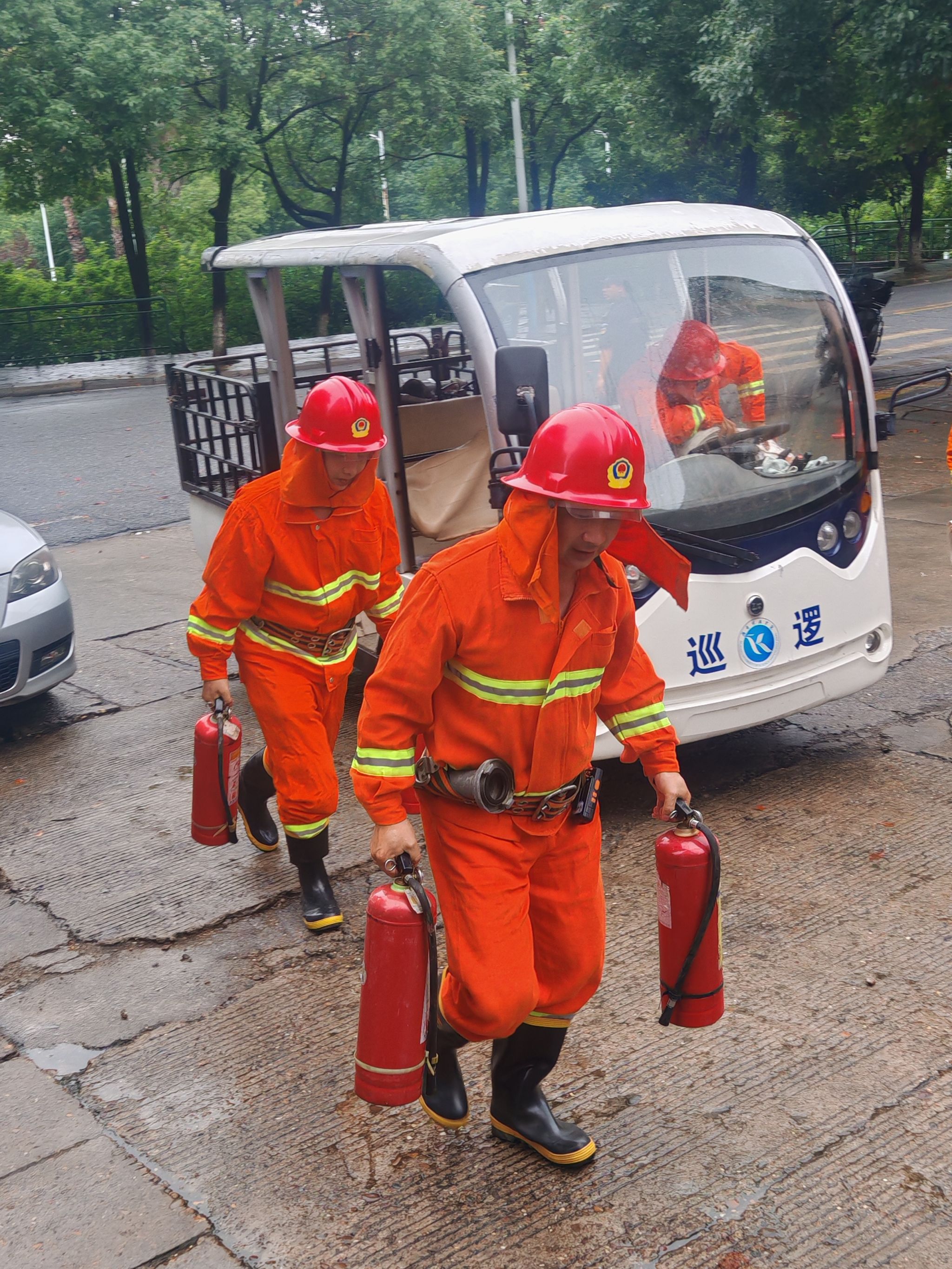 演练过程中,工作人员燃放烟雾弹模拟食堂突发火情,保卫部立即启动预案,各应急小组迅速开展行动。应急小组成员第一时间关闸断电、停运电梯;救援组着消防服携带灭火器、消防水带等专业装备,于3分钟内抵达食堂二楼起火点;就近巡逻的保安也立刻赶来参与疏散工作,大家在工作人员的引导下,弯腰低姿、用湿毛巾捂住口鼻,沿安全通道快速有序撤离至安全地点。救援组用灭火器进行灭火,“火灾”被扑灭,现场无“人员伤亡”,全程未发生推挤、踩踏、滑倒等次生风险,演练圆满结束。