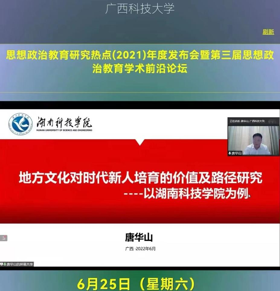 本网讯 6月25日下午,思想政治教育研究热点(2021)年度发布会暨第三届思想政治教育前沿论坛在广西科技大学召开,学生工作部部长唐华山应邀出席会议并线上作了题为《地方文化对时代新人培育的价值及路径研究——以新利·体育为例》的主旨报告。