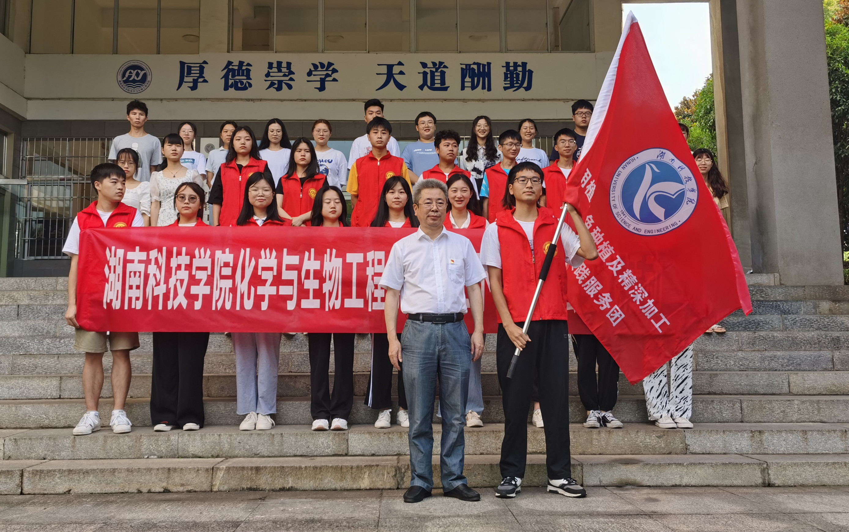 本网讯 7月6号,化学与生物工程学院成立药用植物绿色种植及精深加工乡村振兴实践服务团赴零陵区双济桥村开展“三下乡”社会实践活动。校党委书记曾宝成为实践服务团授旗。