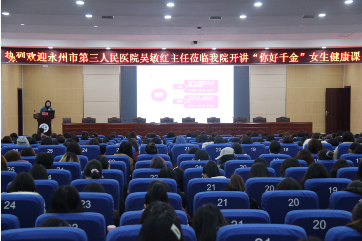 本网讯 3月7日晚,经济与管理学院在潇湘大讲堂开展“你好千金”女生健康知识主题讲座。邀请永州市第三人民医院妇产科副主任医师吴敏红主讲,学院600余名女生共同聆听。