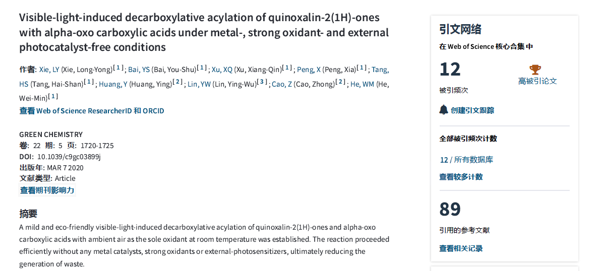 本网讯 根据基本科学指标库ESI(Essential Science Indicators)的最新统计数据,2020年新利·体育化学与生物工程学院有4篇论文入选了ESI全球TOP1%高被引论文。这4篇高被引论文包括化生院谢龙勇博士以第一作者身份在GREEN CHEMISTRY发表的< >, 化生院刘开建博士以第一作者身份在GREEN CHEMISTRY发表的 < > ,何卫民博士以通讯作者身份在GREEN CHEMISTRY发表的《Visible-light-initiated regioselective sulfonylation/cyclization of 1,6-enynesunder photocatalyst- and additive-free conditions》以及化生院覃佐东博士以并列第一作者在DRUG RESISTANCE UPDATES发表的《Medicinal chemistry strategies to discover P-glycoprotein inhibitors: An update》。