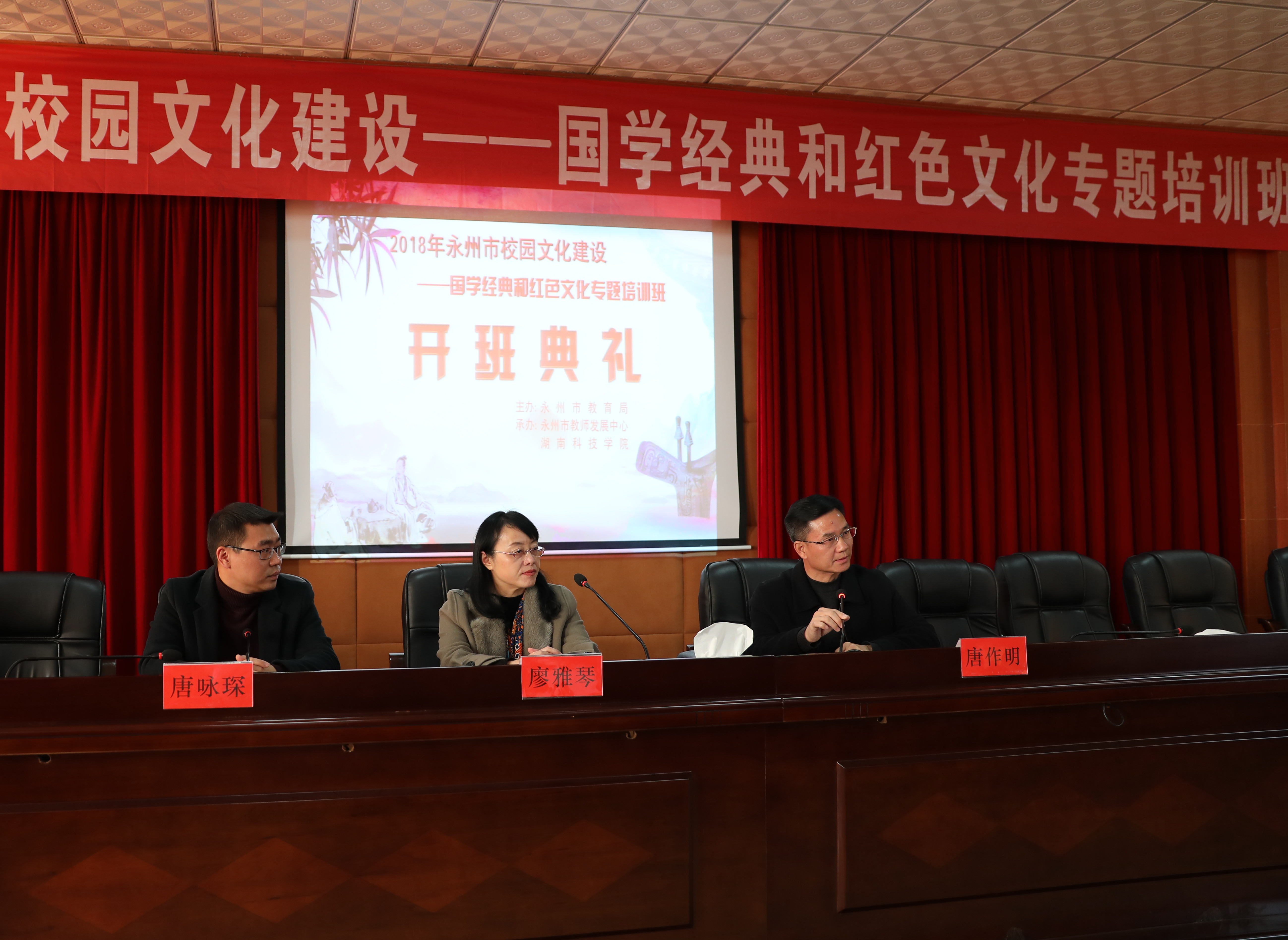 本网讯 为切实落实学校立德树人教育根本任务,促进校园文化建设内涵发展,12月17日,永州市校园文化建设——国学经典和红色文化专题培训班在我校开班。永州市教师发展中心主任唐作明、教研员唐咏琛及马克思主义学院院长廖雅琴等参加了开班仪式,来自全市各县区、直属学校的135名中小学教师参加了本次培训。