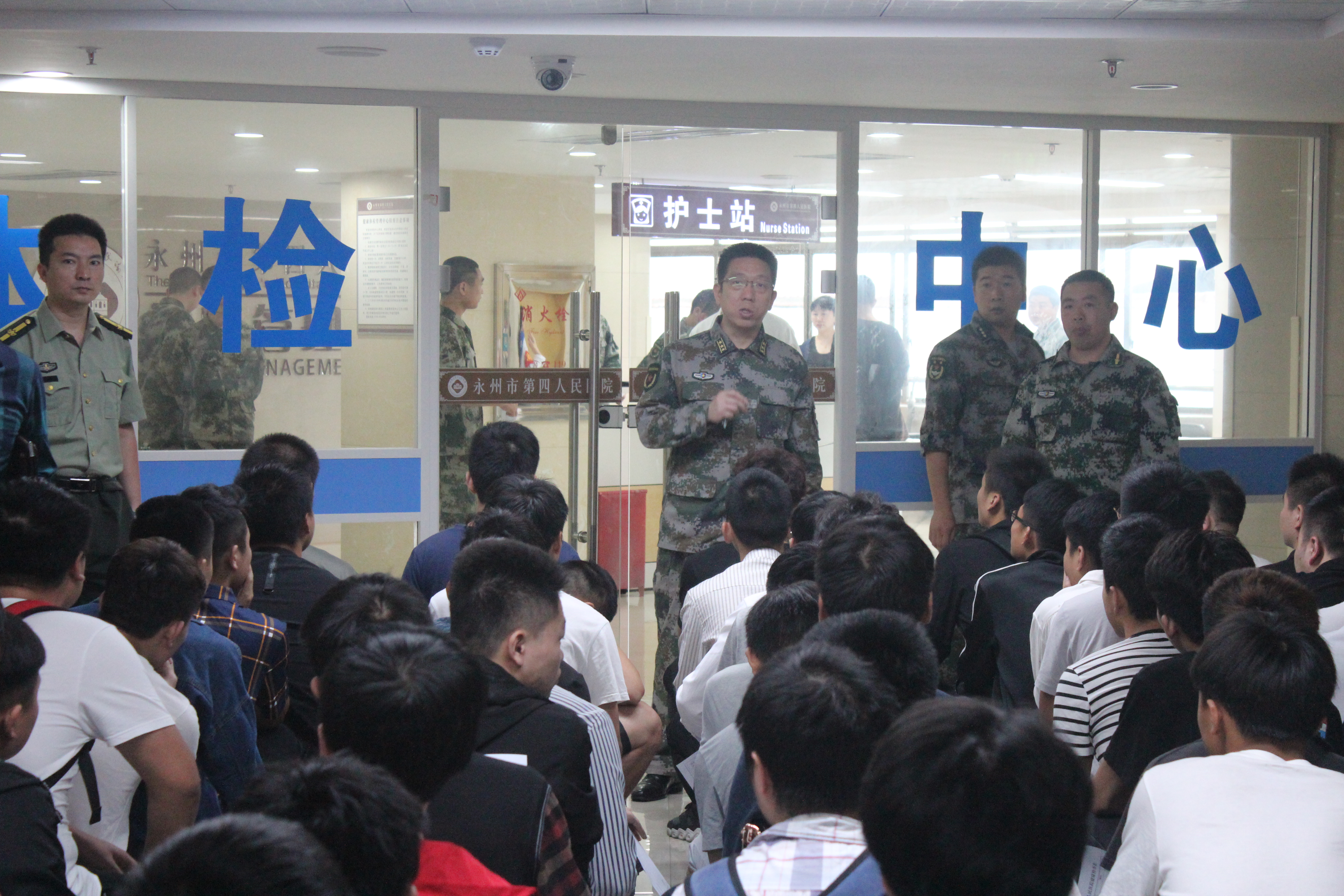 本网讯 为落实2018年夏秋季征兵工作,为部队输送优质兵源, 6月2日上午,新利·体育武装部组织83名应征入伍男生统一前往永州市第四人民医院进行征兵预检。