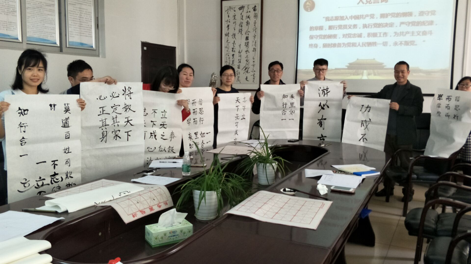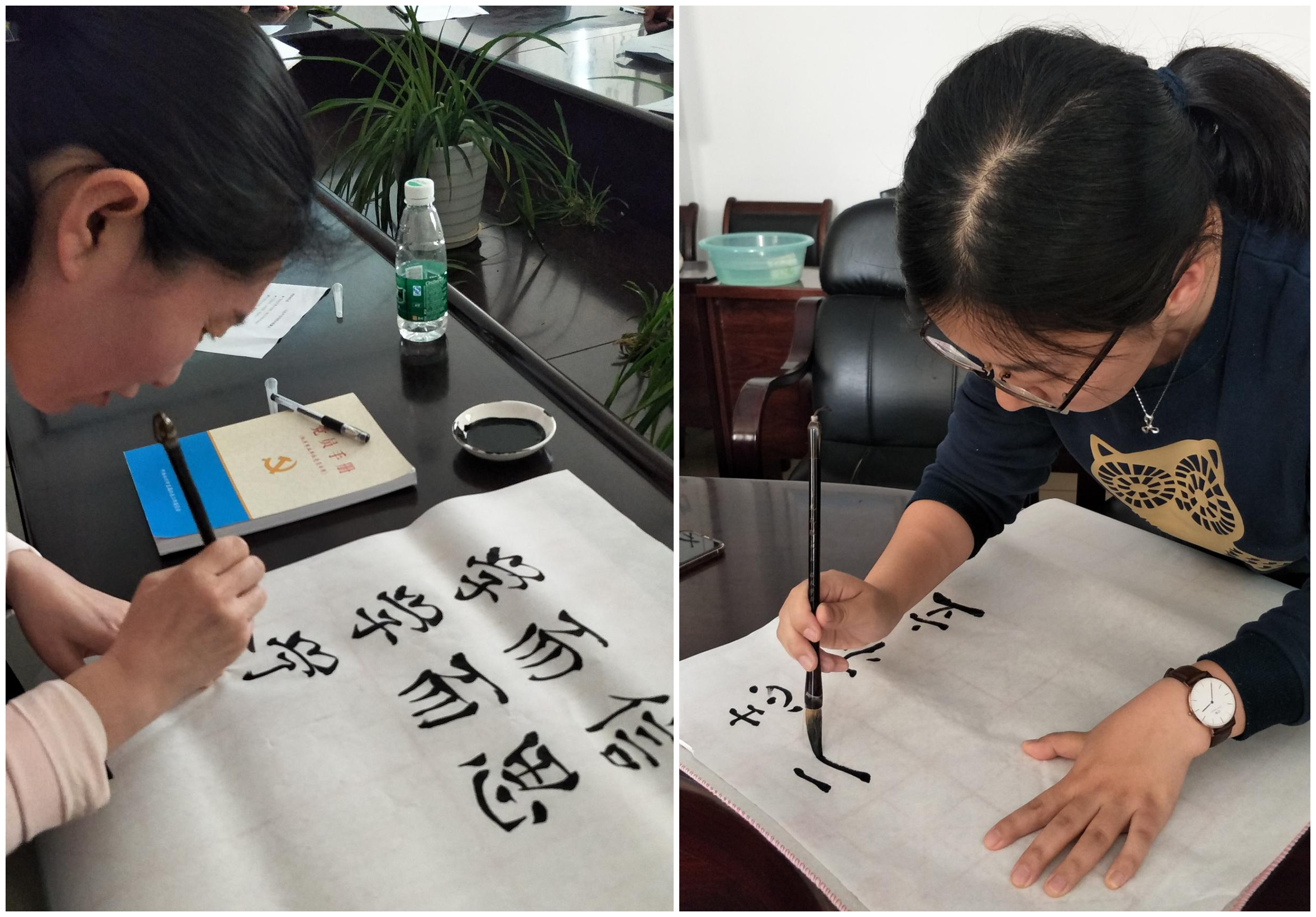 两个支部的全体党员在学习党章、重温誓词和缴纳党费之后,认真学习了习近平新时代中国特色社会主义思想,特别赏析了习近平总书记系列重要讲话、报告和文章中体现其治国理政新思想的箴言,并用毛笔把这些箴言书写了出来。大家还结合工作实际畅谈了践行新思想的体会和打算。