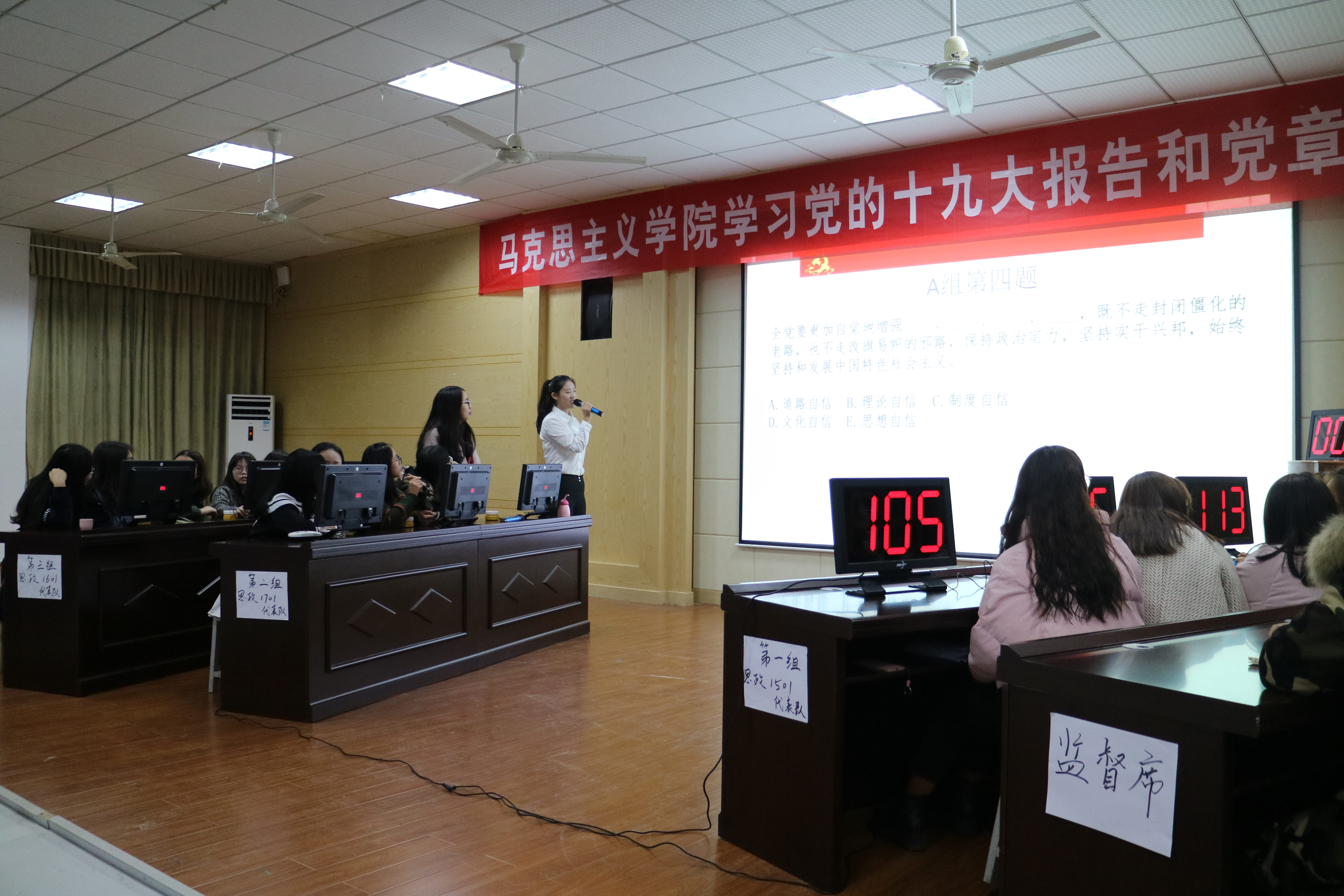 本网讯 为进一步深刻领会十九大精神的内涵和重大意义,切实在学懂弄通做实上下功夫,11月24日晚,马克思主义学院在致远楼701举办“学习党的十九大报告和党章党史知识”抢答赛活动。该院党总支副书记兼副院长李观求及全体班主任老师参加此次活动。