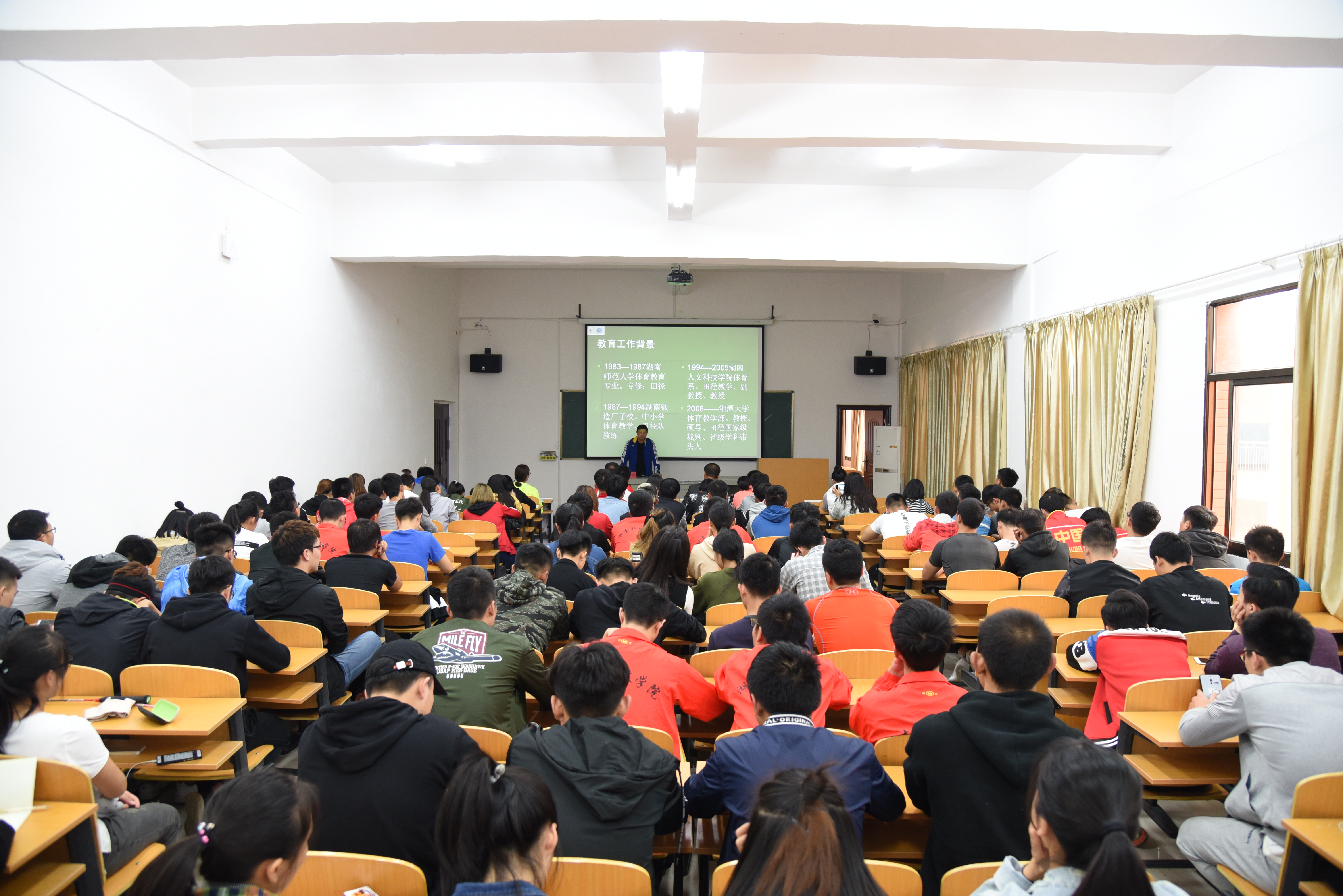 本网讯 10月25日下午,湘潭大学硕士研究生导师熊茂湘教授应邀来我校作题为《基于供给侧改革的少儿田径新思路》的学术讲座,体育学院师生聆听讲座,体育学院院长刘根发主持讲座。