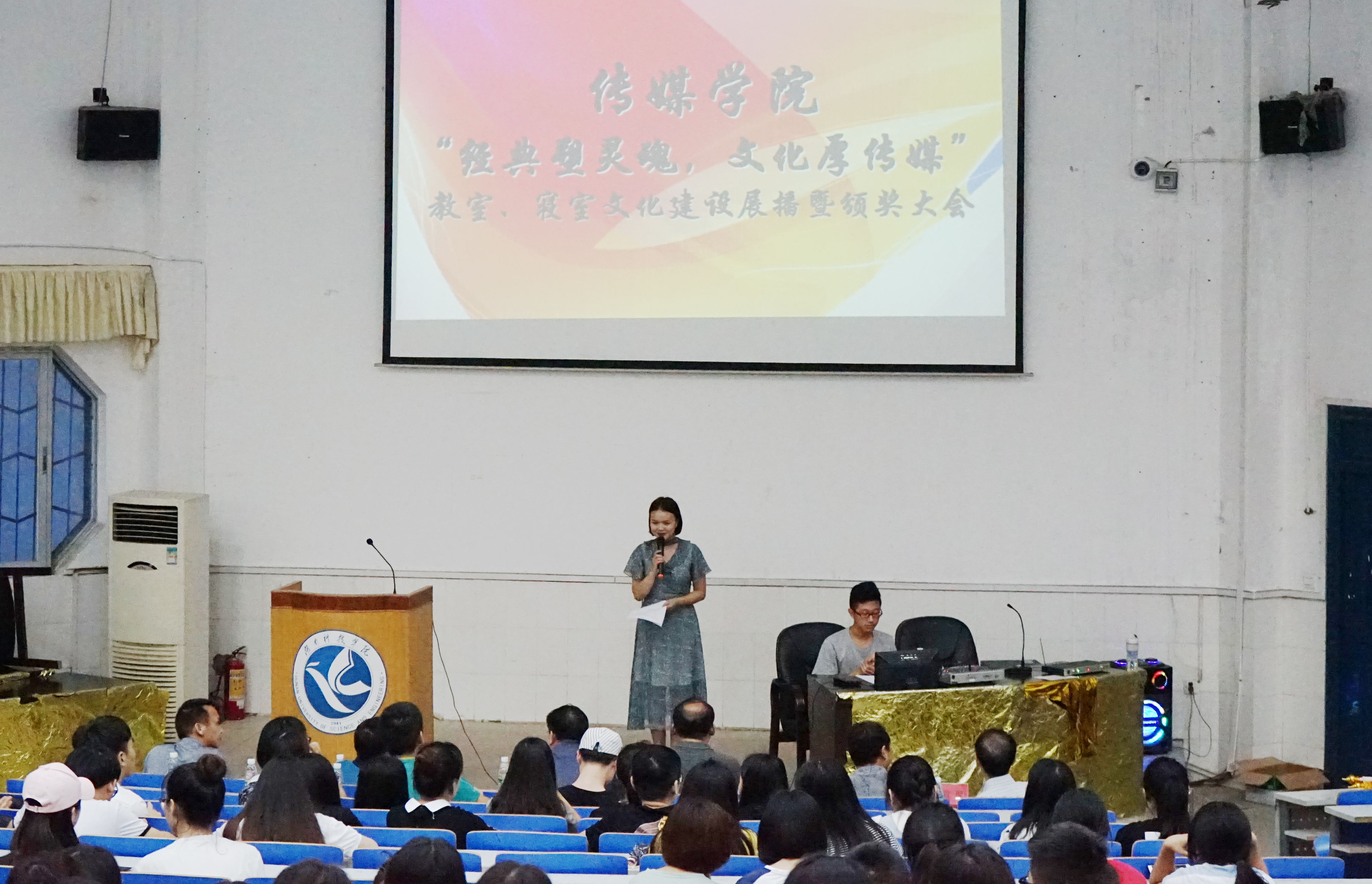 本网讯 6月26日晚,传媒学院“经典塑灵魂,文化厚传媒”教室寝室文化建设展播暨颁奖仪式在日新楼举行。学工部长唐华山、校团委副书记刘佳以及传媒学院全体领导出席仪式。