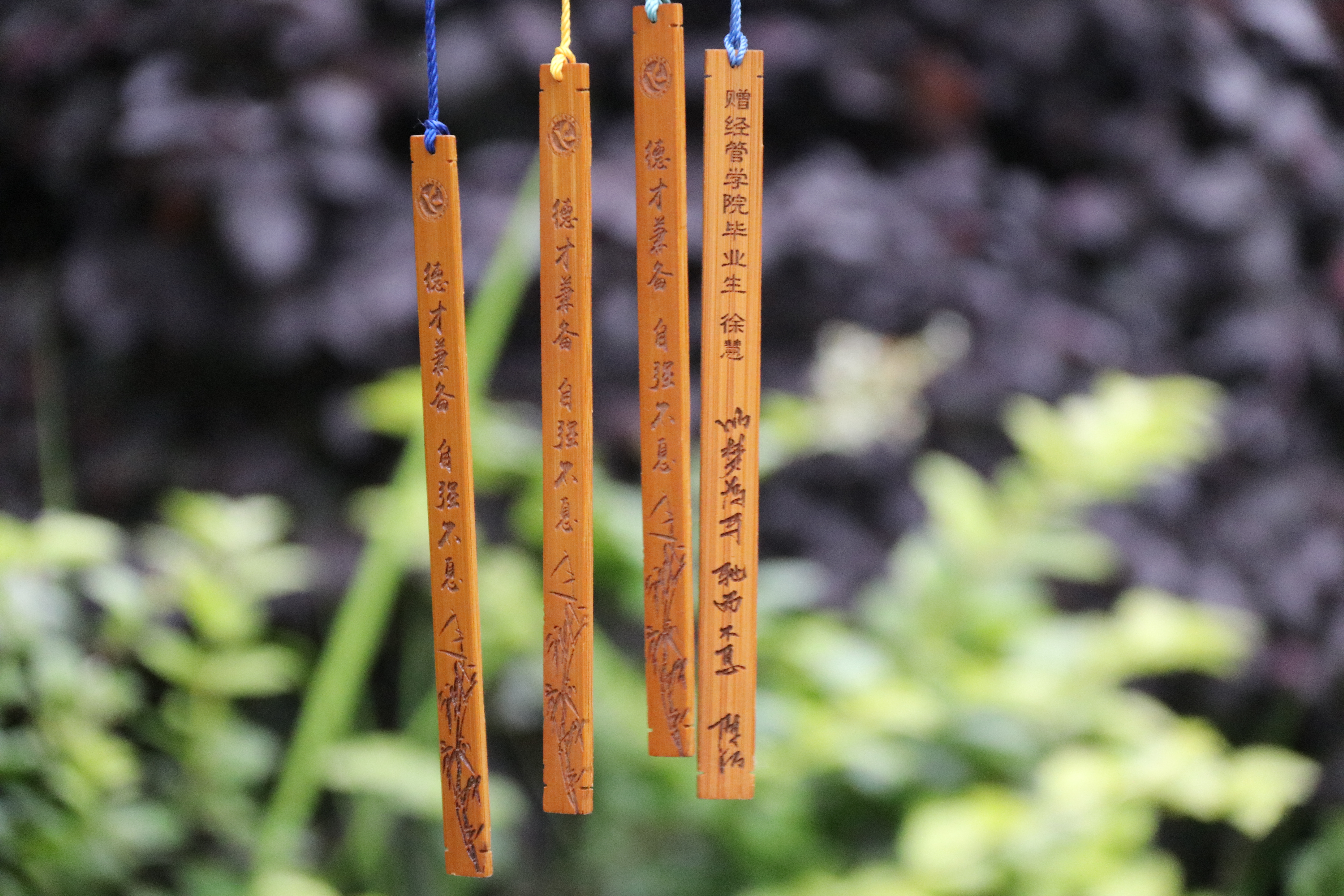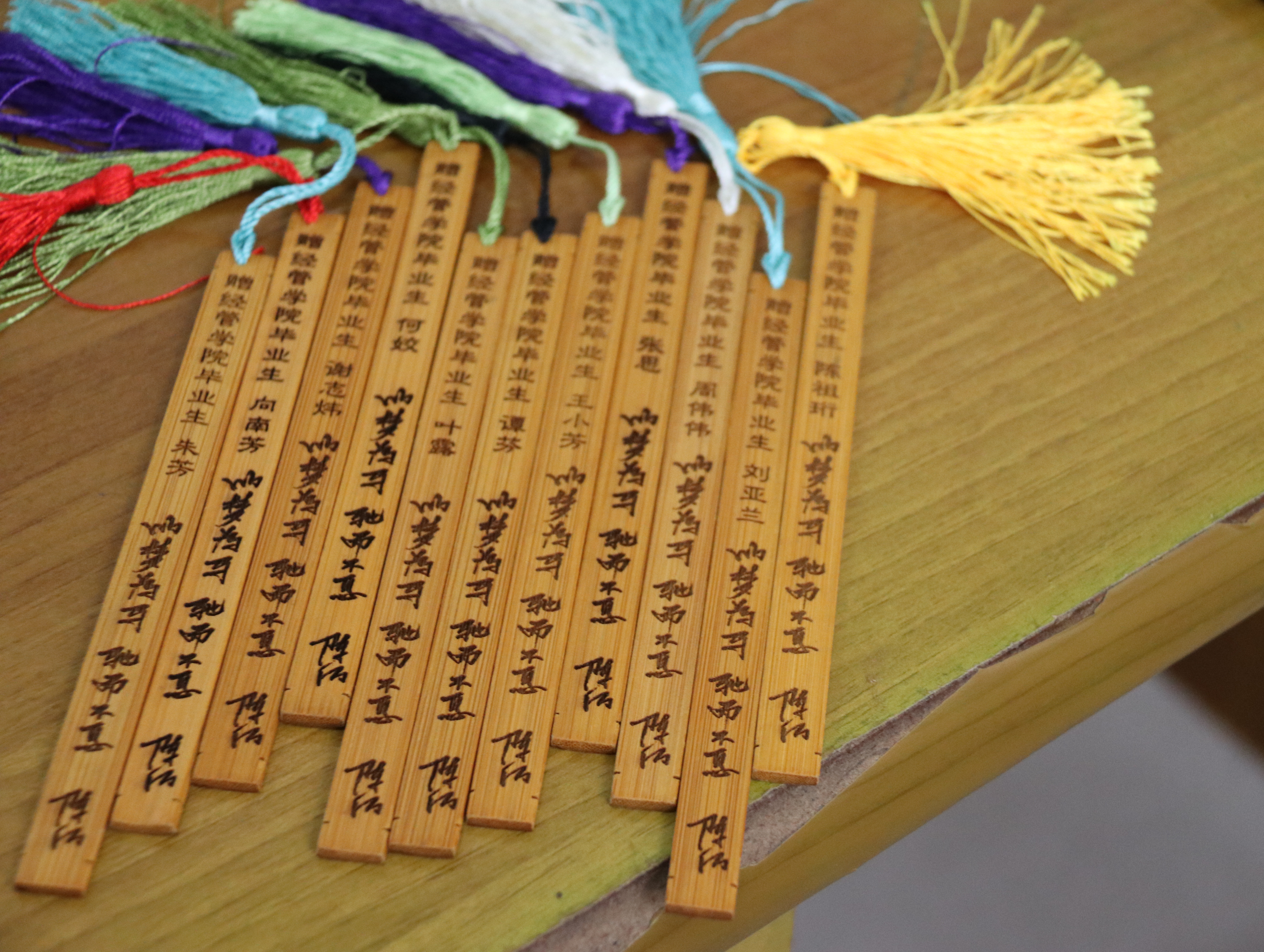 书签是木制长条形,一面刻有每一名毕业生的名字以及校党委书记陈弘书记“以梦为马,驰而不息”的寄语,希望每一位毕业生都能够怀着自己的梦想,永不停歇的愿望;另一面刻着新利·体育的校徽和“德才兼备,自强不息”的校训,同时还刻有竹叶,寓意着挺拔洒脱、正直清高的品质。