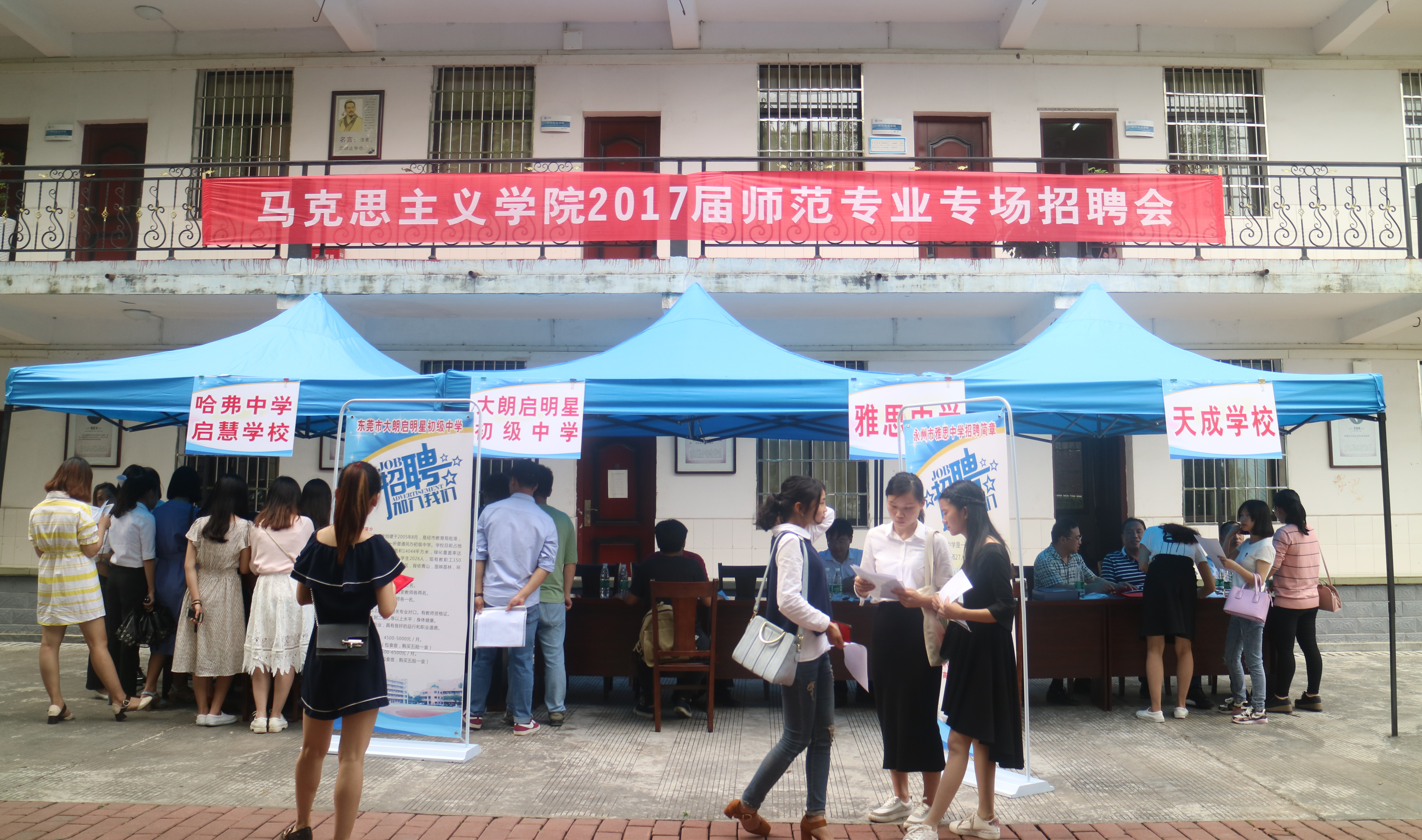 本网讯 5月16日下午,马克思主义学院举行2017师范类专场招聘会,经过筛选本次招聘会共邀请5家用人单位参,提供各科教师岗位95个,吸引了来自不同院系的上百名毕业生前来应聘。
