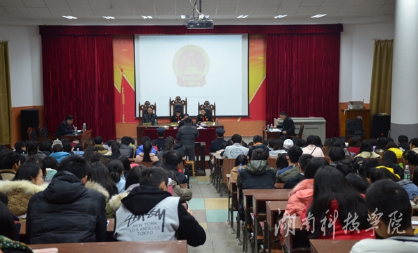 本网讯(通讯员 熊焕颖)12月1日,永州市零陵区人民法院刑事审判庭在明德楼报告厅公开审理“高某系列敲诈勒索案”。人文与社会科学学院法律系14级、15级全体学生现场观摩了整个庭审过程。该院首次将法庭庭审现场带入实践教学环节,是实践教学的一次创新性举措。
