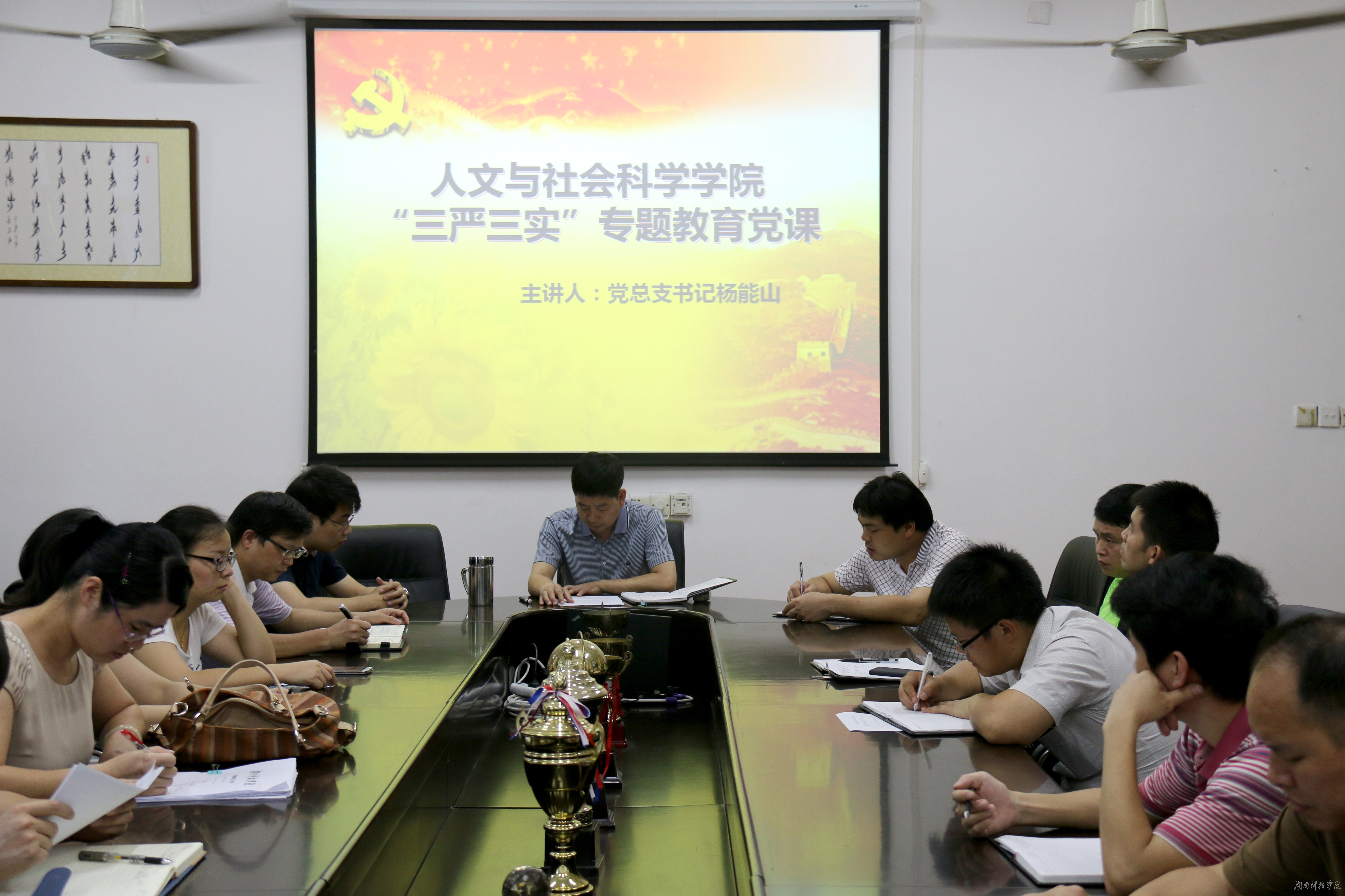 本网讯(记者 龙满金)6月2日下午,人文与社会科学学院在明德楼上“三严三实”专题教育党课,学习贯彻“三严三实”重要精神。该院全体正式党员参加学习,党总支书记杨能山主讲。
