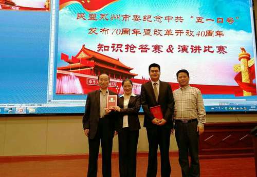 4月27日,民盟永州市委举行纪念中共“五一口号”发布70周年暨改革开放40周年系列活动之知识抢答赛和演讲比赛,我校民盟支部参加了比赛,永州市委常委统战部部长石艳萍、民盟永州市委主委袁火林到场观看。