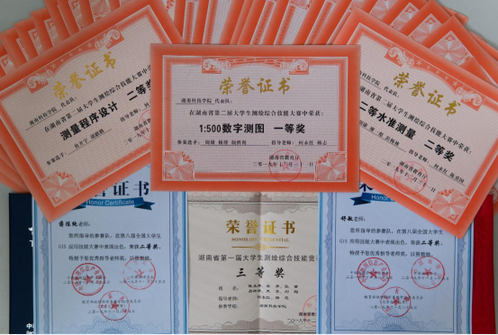 三、人才培养 学生近三年在教育厅等部门组织的官方权威赛事和行业内有影响力的企业赛事中获得可喜成绩,获得全国大学生测绘技能竞赛特等奖1项,一等奖4项,二等奖6项,专业组团体二等奖1项。全国大学生GIS应用技能大赛中二等奖3项,湖南省测绘技能大赛一等奖2项、二等奖6项、三等奖12项,在2018年获团中央“镜头中的三下乡”优秀团队荣获全国三下乡重点团队。测绘工程专业考研上线人数、录取人数逐年上升,部分学生录取到中国地质大学、长安大学、广东工业大学等高校攻读硕士研究生,考研率达20%左右。