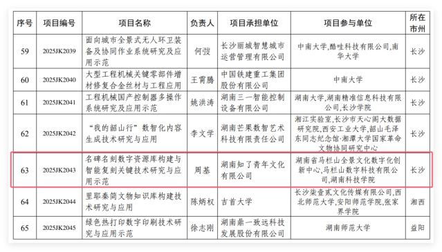 本网讯(通讯员 胡佳星 谢超)近日,湖南省科技厅发布了《关于2025年度湖南省重点研发计划项目立项的通知》,正式立项223项2025年度湖南省重点研发计划项目,由我校“砖石质文物智慧化保护利用技术湖南省重点实验室”主任周基教授作为负责人,湖南知了青年文化有限公司作为项目承担单位,湖南省马栏山全景文化数字化创新中心、马栏山数字科技有限公司、新利·体育作为参与单位的科研项目“名碑名刻数字资源库构建与智能复刻关键技术研究与应用示范”成功入选。
