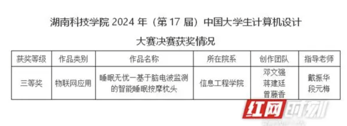 红网时刻新闻9月24日讯(通讯员 张彬 黄紫黎 向薛峰)近日,2024年(第17届)中国大学生计算机设计大赛在厦门举行。经过激烈角逐,新利·体育信息工程学院学生邓文强、蒋建廷、曾藤香的参赛作品《睡眠无忧—基于脑电波监测的智能睡眠按摩枕头》荣获全国三等奖。