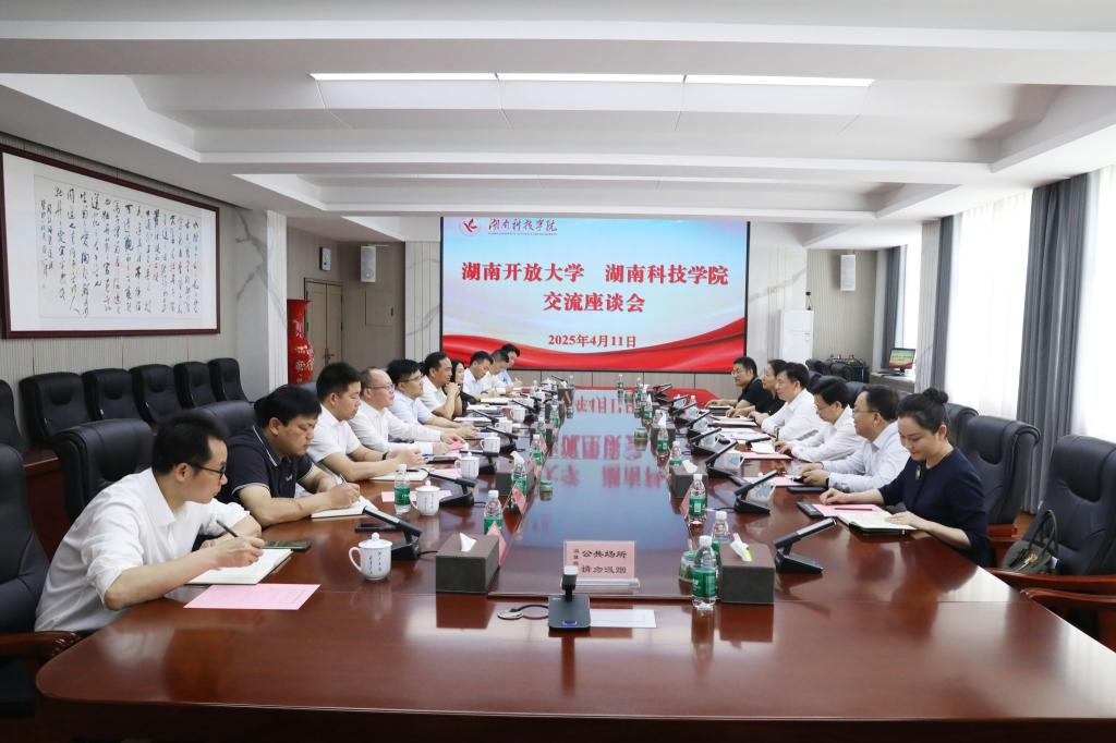 本网讯(记者谢志豪)4月11日,湖南开放大学党委书记龙献忠,副校长陈志国、梁晖来校交流,我校党委书记李钢、校长黄创霞、副校长何海参加座谈交流,黄创霞主持座谈会。