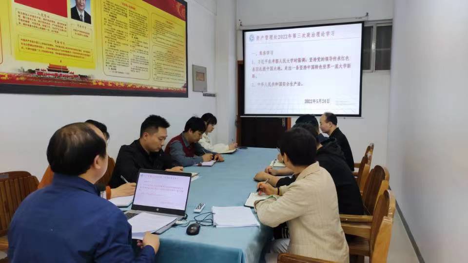 2022年5月24日下午,根据学校五月份政治理论学习计划,资产管理处开展2022年第三次政治理论学习第二次活动,组织部门全体成员集中学习了习近平总书记在人民大学考察调研的重要指示精神,并要求部门全体成员自学了《中华人民共和国安全生产法》的相关内容。